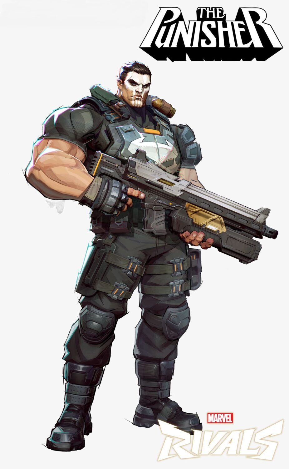 The Punisher #1(Marvel Rivals Variant) – Netease delivers clean, high-gloss character rendering. This version of Frank Castle stands centered with oversized tactical weaponry and stylized armor design. The background is minimal, allowing the character model to shine. The rendering is smooth and almost game-concept art polished. It is sleek, controlled, and hyper-modern in execution.
